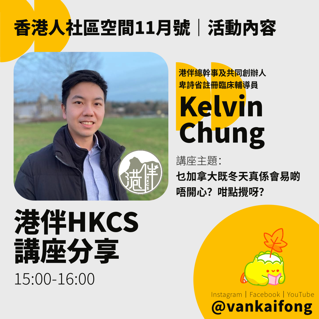 街坊會今個月請嚟卑詩省註冊臨床輔導員 和 **「港伴」**總幹事及創辦人 Kelvin Chung, 同大家傾下點樣處理 Winter Blues!