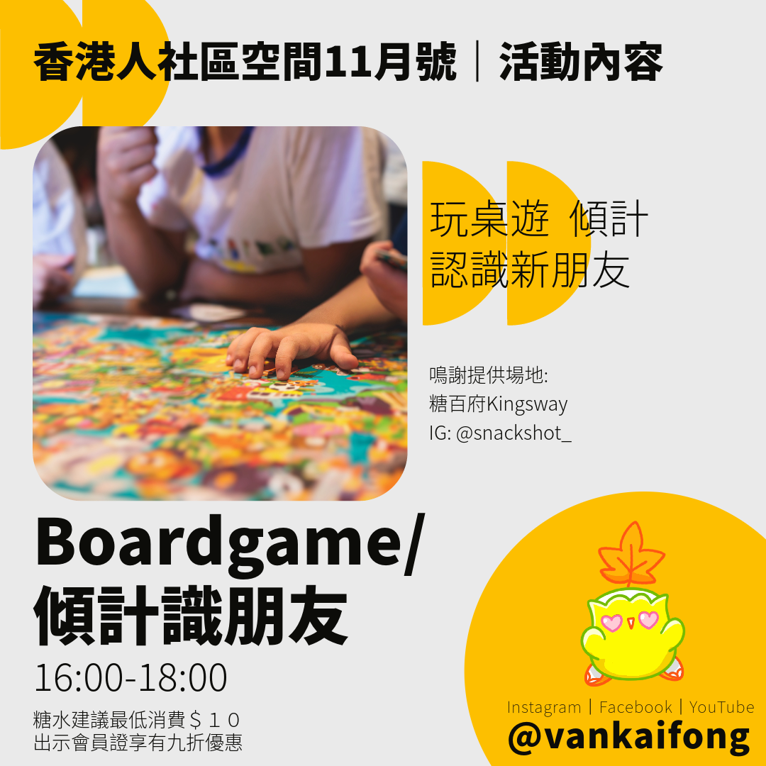 - 16:00 – 18:00 玩boardgame 吹水傾計識朋友 😃😁😍🤪😎🥸🤩🥳🧐🤭