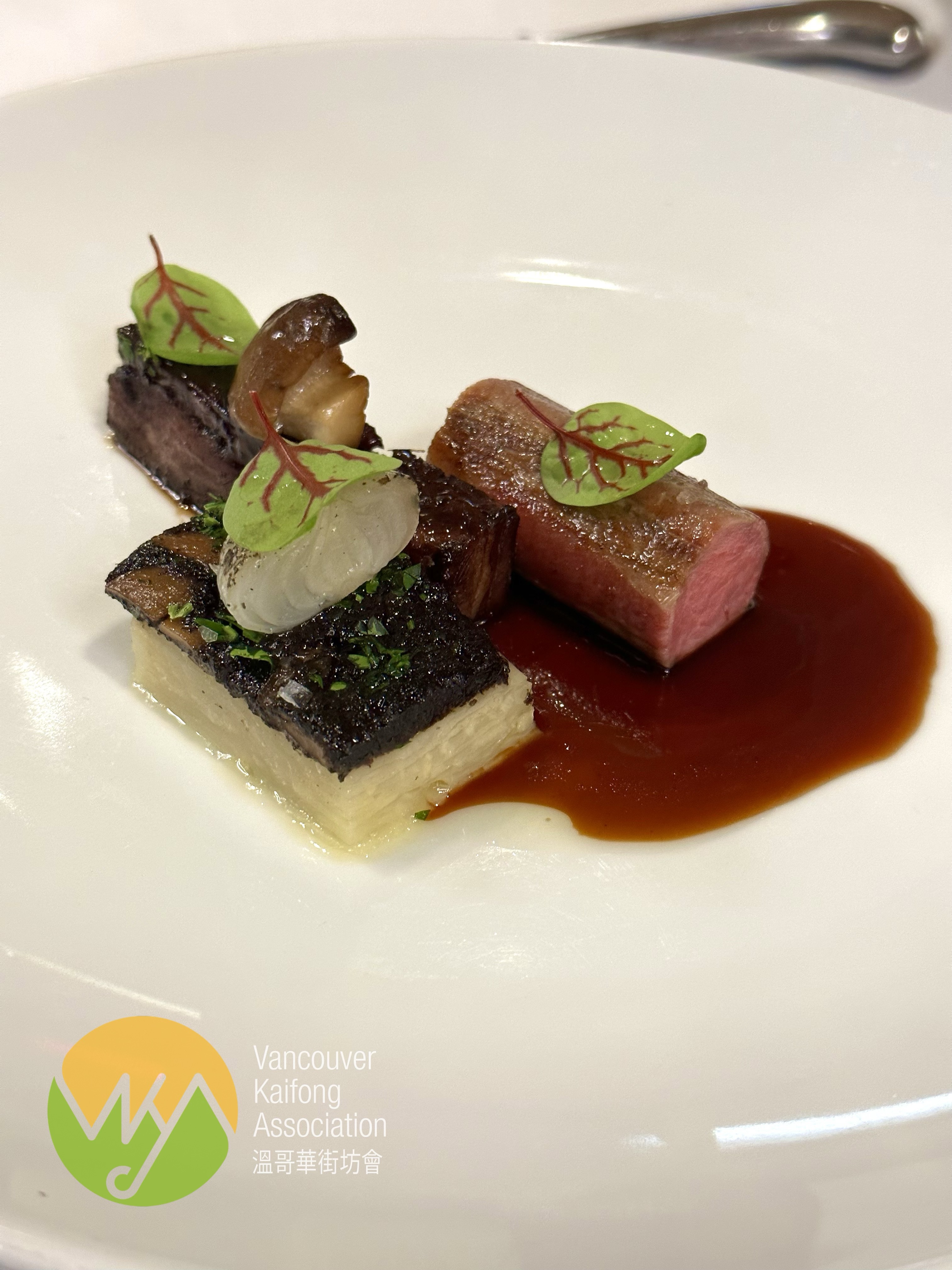 第四道係羊二食,中間係羊肩肉,右面係用煙肉捲住羊肉再煎,兩種不同味道,很有趣。左面係疊起的白蘿蔔,唔知係咪吸收了醬汁所以味道濃郁。