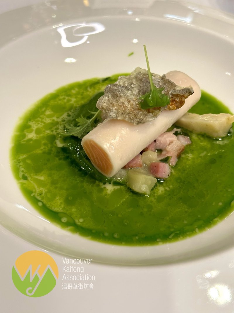 第二道菜係將煙三文魚用很薄嘅帶子捲住,配上羅勒醬汁,很醒神嘅一道前菜。